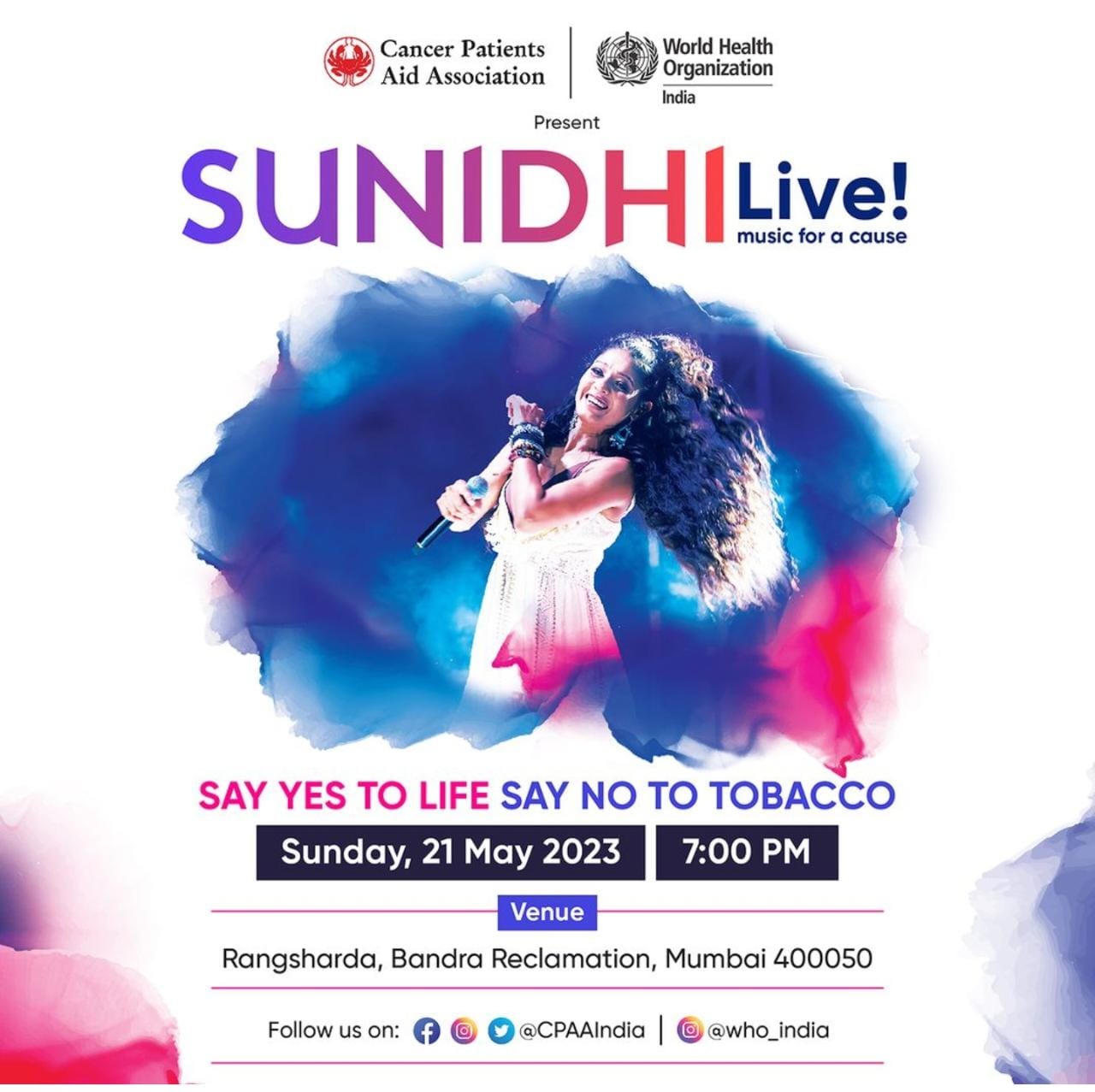 The event was organized by the Cancer Patients Aid Association (CPAA), Mumbai in technical collaboration with WHO Country Office for India. This year, the concert featured Ms Sunidhi Chauhan, a youth icon and a well-known singer and performer from the Indian film industry. The concert also saw a performance from Mr Divyansh Kacholia aka DVK Beatboxer, the winner of India's Got Talent Season 9, who regularly performs with Ms Sunidhi Chauhan.