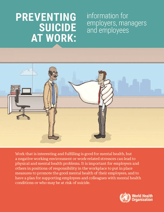 For workplace settings, WHO has produced Guidelines on mental health at work, which provide evidence-based recommendations to promote mental health and prevent suicide and mental health conditions in the workplace. A resource targeting employers and colleagues to prevent suicide at work has also been produced.