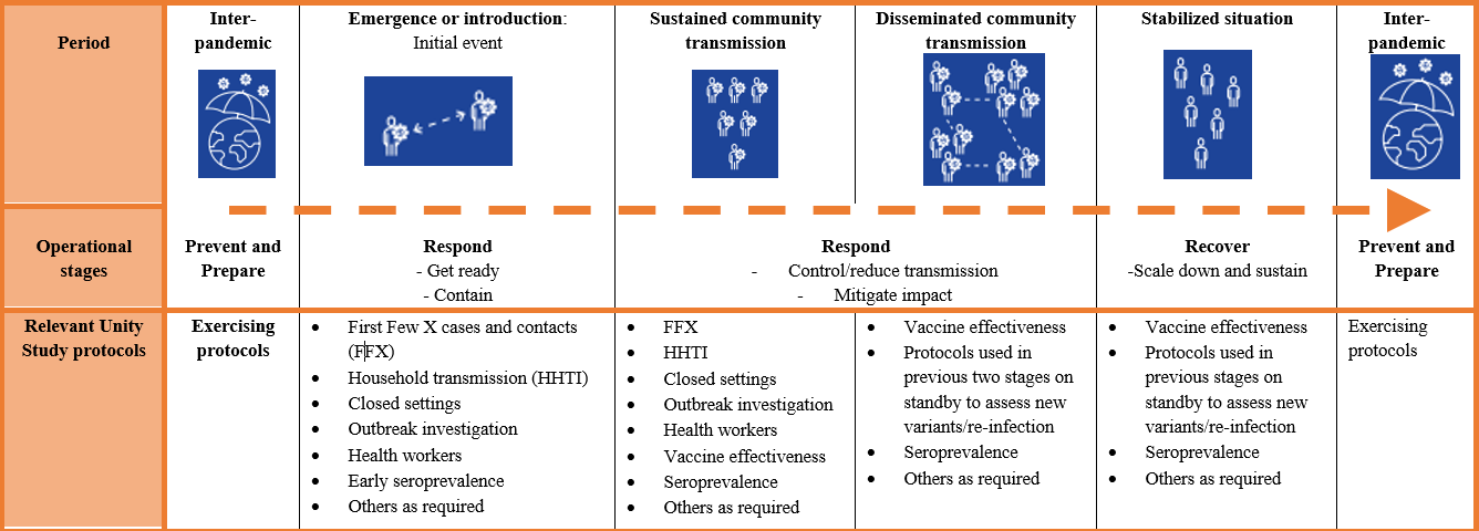 Table 1: Unity Studies protocols aligned with the pandemic periods of the organizing framework for respiratory pathogen pandemic planning, Preparedness and Resilience for Emerging Threats (PRET) (https://www.who.int/publications/m/item/preparedness-and-resilience-for-emerging-threats-module-1-planning-for-respiratory-pathogen-pandemics-version-1)